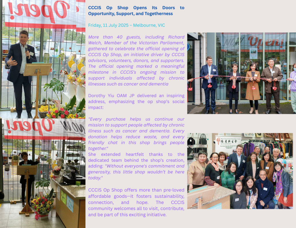The Chinese Cancer and Chronic Illness Society of Victoria — a registered charity supporting individuals affected by cancer and other chronic illnesses since 1996 — has recently opened a new Op Shop in Croydon.